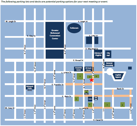 Please allow for ample time to find parking, as lots in downtown Richmond fill quickly while the General Assembly is in session. The Credit Union House of Virginia has provided recommendations for parking near the facility. Below is a map of lots near the venue. For a downloadable map, click here.